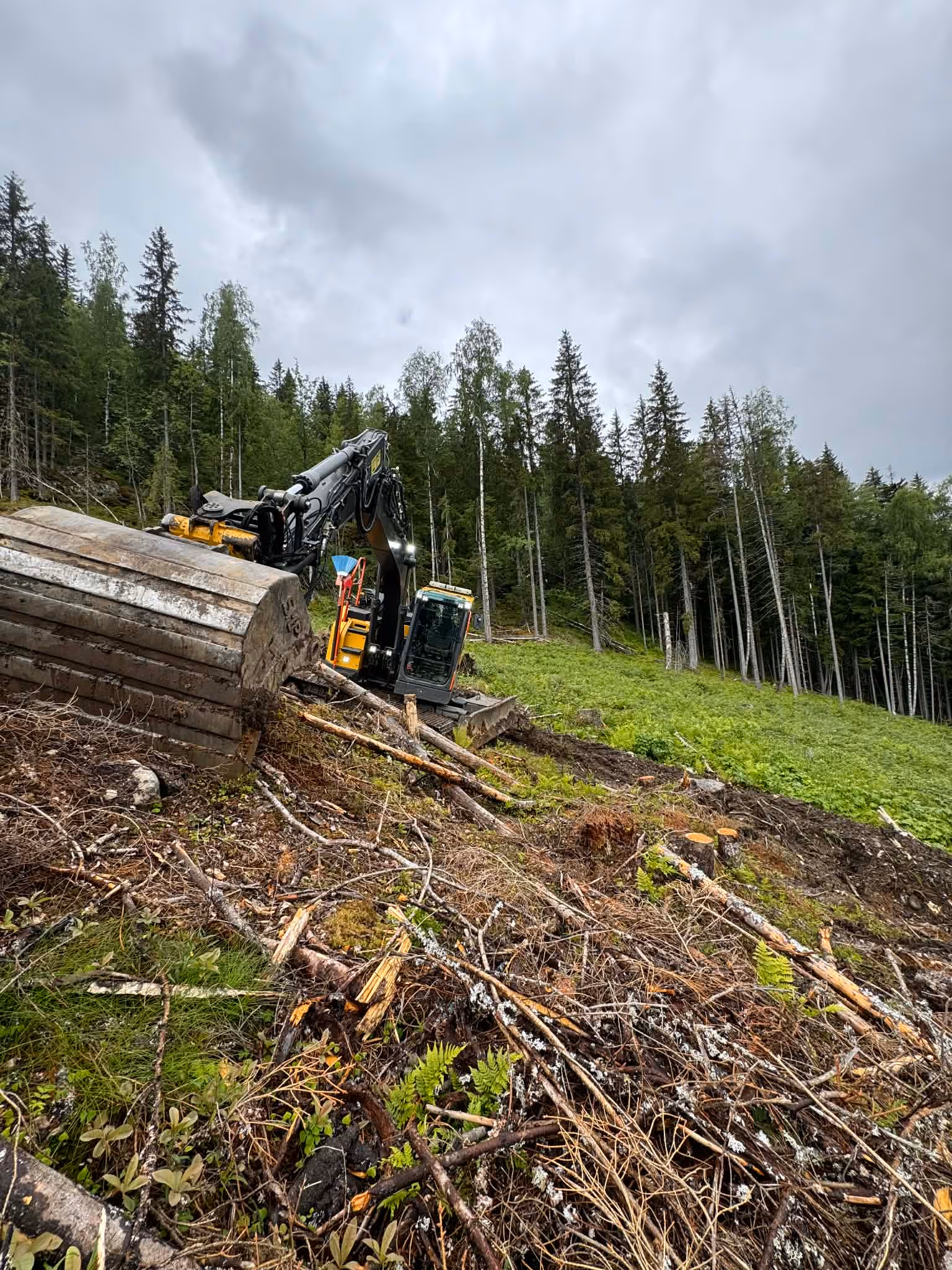 Med riktig utstyr og erfaring utfører vi skogsarbeid effektivt, også i krevende terreng.
